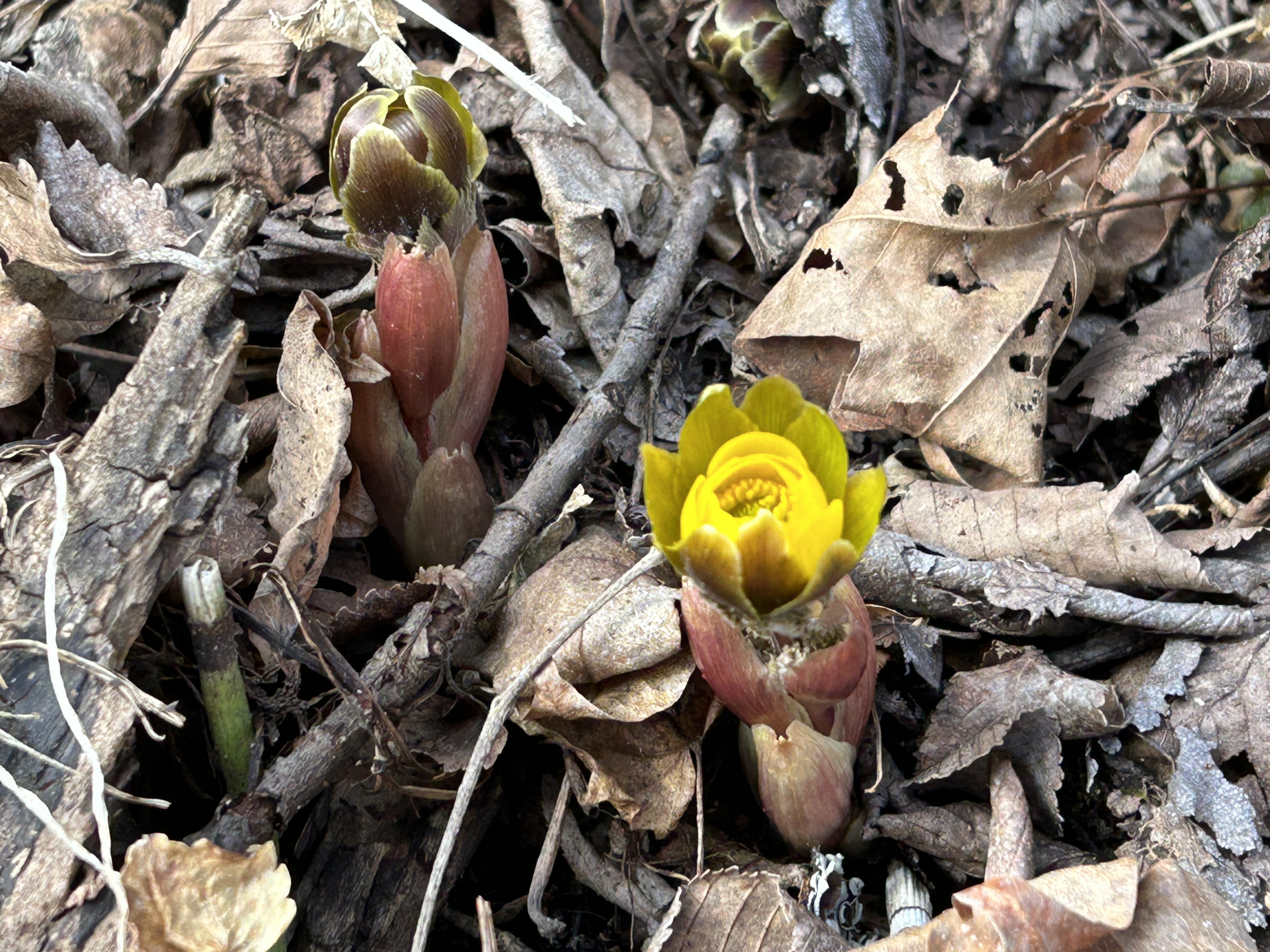 フクジュソウです。残雪がある春に黄色い花を咲かせるキンポウゲ科の多年草。春を告げる植物ですね。「福寿草」という漢字表記。アイヌ語でチライムンと言うそうです(十勝以外では異なる言い方をするそう)。