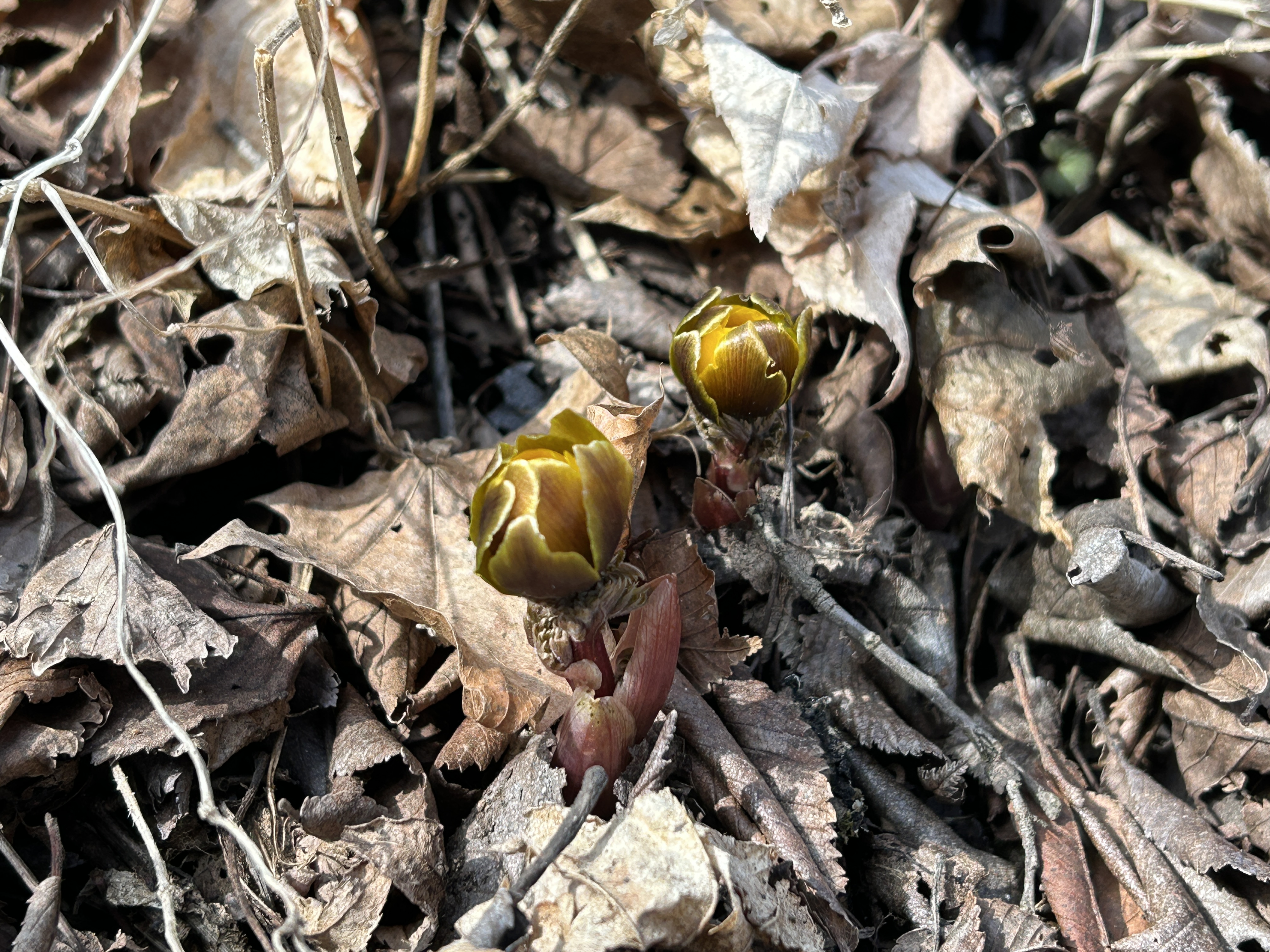 雪がまだ残る本別町の林内………。ところどころ雪解けと共に地表面が見えるようになってきました。久しぶりに森の中で自然の音でも聴きながら深呼吸しようと遊歩道を散策していると,とある植物の蕾がちょこんと。