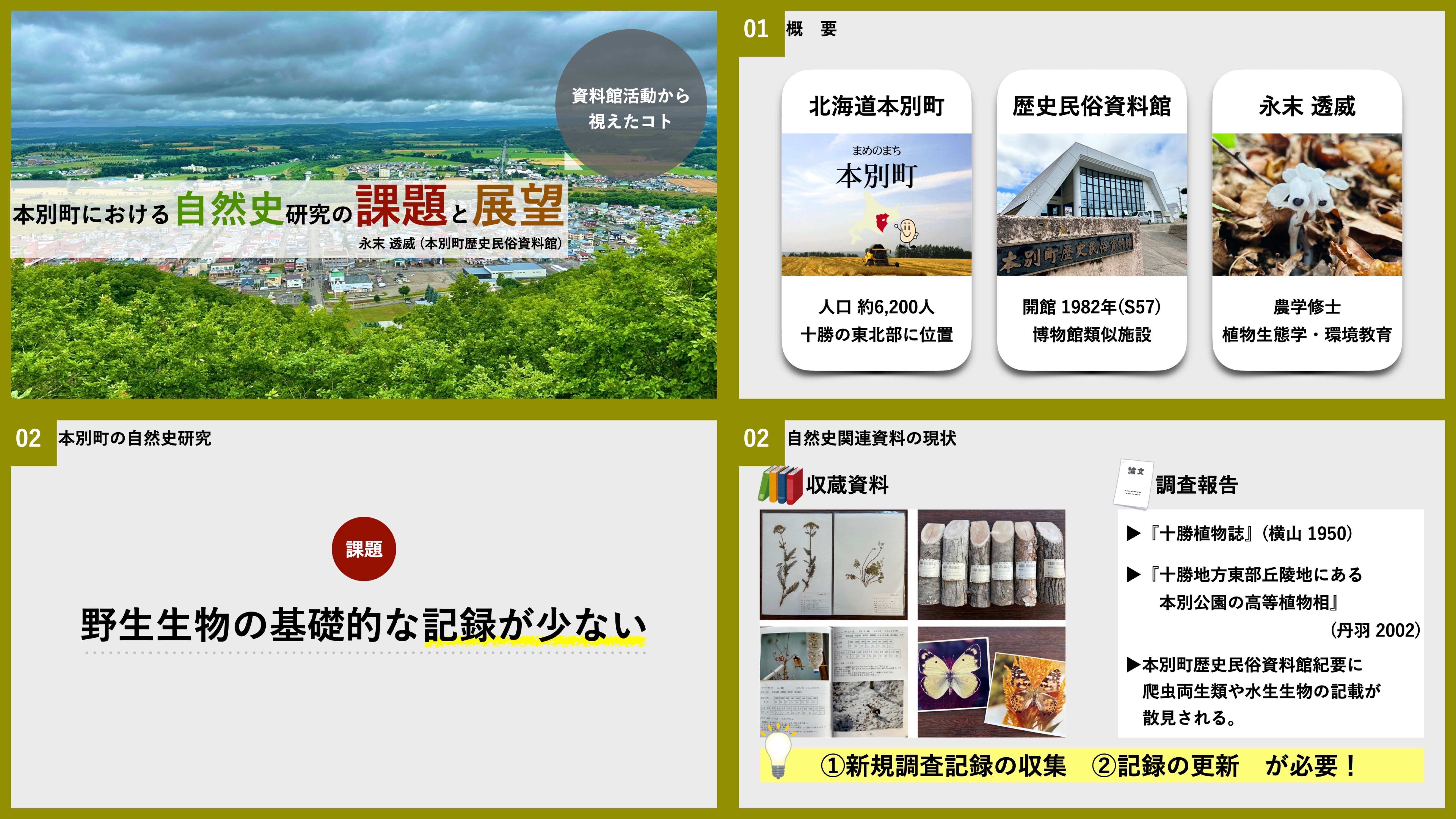 私は表題「本別町における自然史研究の課題と展望ー資料館活動から視えたコトー」として,本別町あるいは資料館が抱える自然史記録の現状と今後の資料館活動の展開についてお話ししました。
