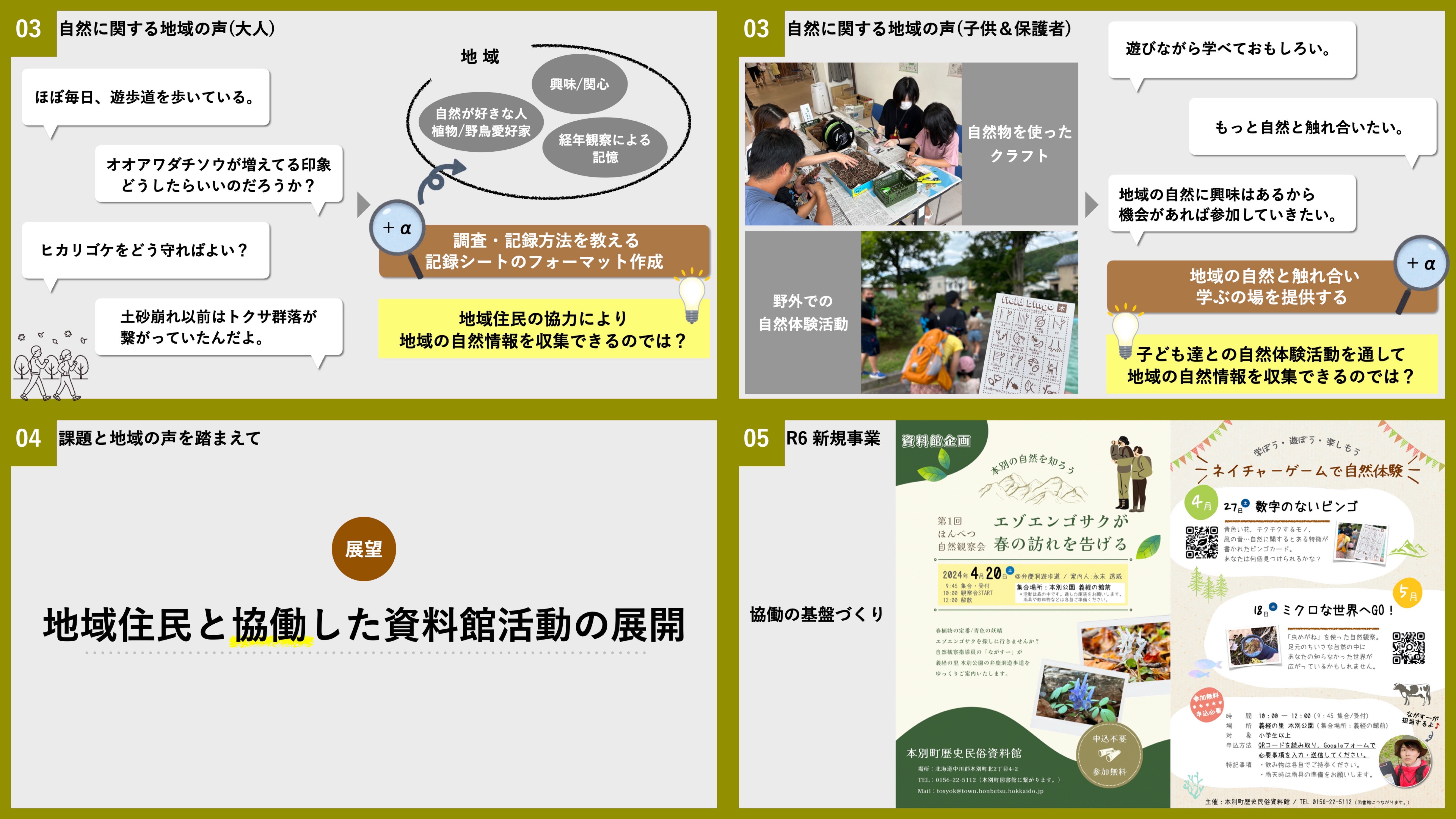資料館では2024年4月から資料館主催の新規事業「ほんべつ自然観察会」「ネイチャーゲームで自然体験」を開催する予定です(近日,情報公開!)。地域住民と協働した資料館活動の展開に向けた基盤づくり。まずは,地域の自然に親しみをもってもらうことから始めていきます。色々と模索しながら資料館活動を進めていきますので,今後とも本別町歴史民俗資料館の動向をチェックしていてください!